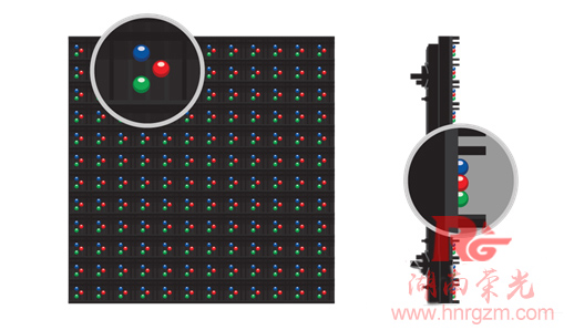 直插式LED通過(guò)引線連接電路板,位置更高。每個(gè)LED燈珠是紅、綠、藍(lán)單色燈珠。直插式LED